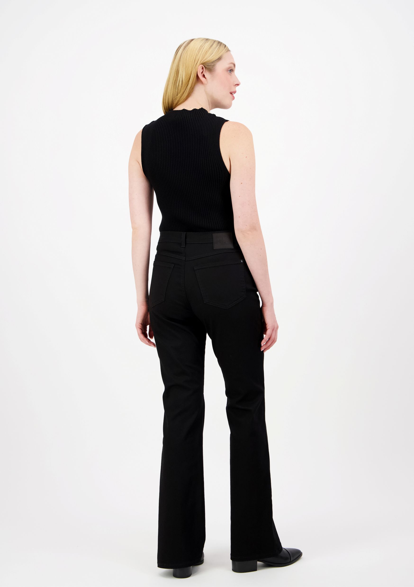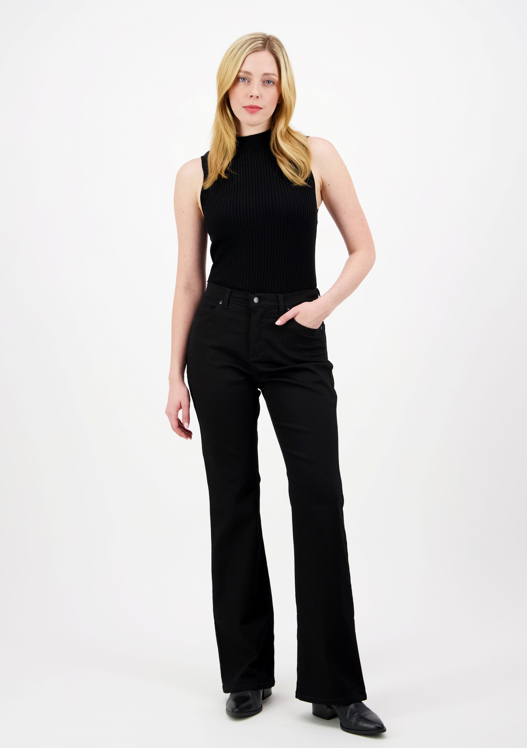 Lahje levenee polven kohdalta ja luo imartelevan bootcut-lahkeenlinjan. Monikäyttöiset, siistit mustat farkut mustilla tikkauksilla sopivat erinomaisesti myös juhlaan. Materiaali on modaalin ansiosta kevyt, pehmeä ja erittäin joustava. Stay Black -kankaassa on erinomainen värinkesto.