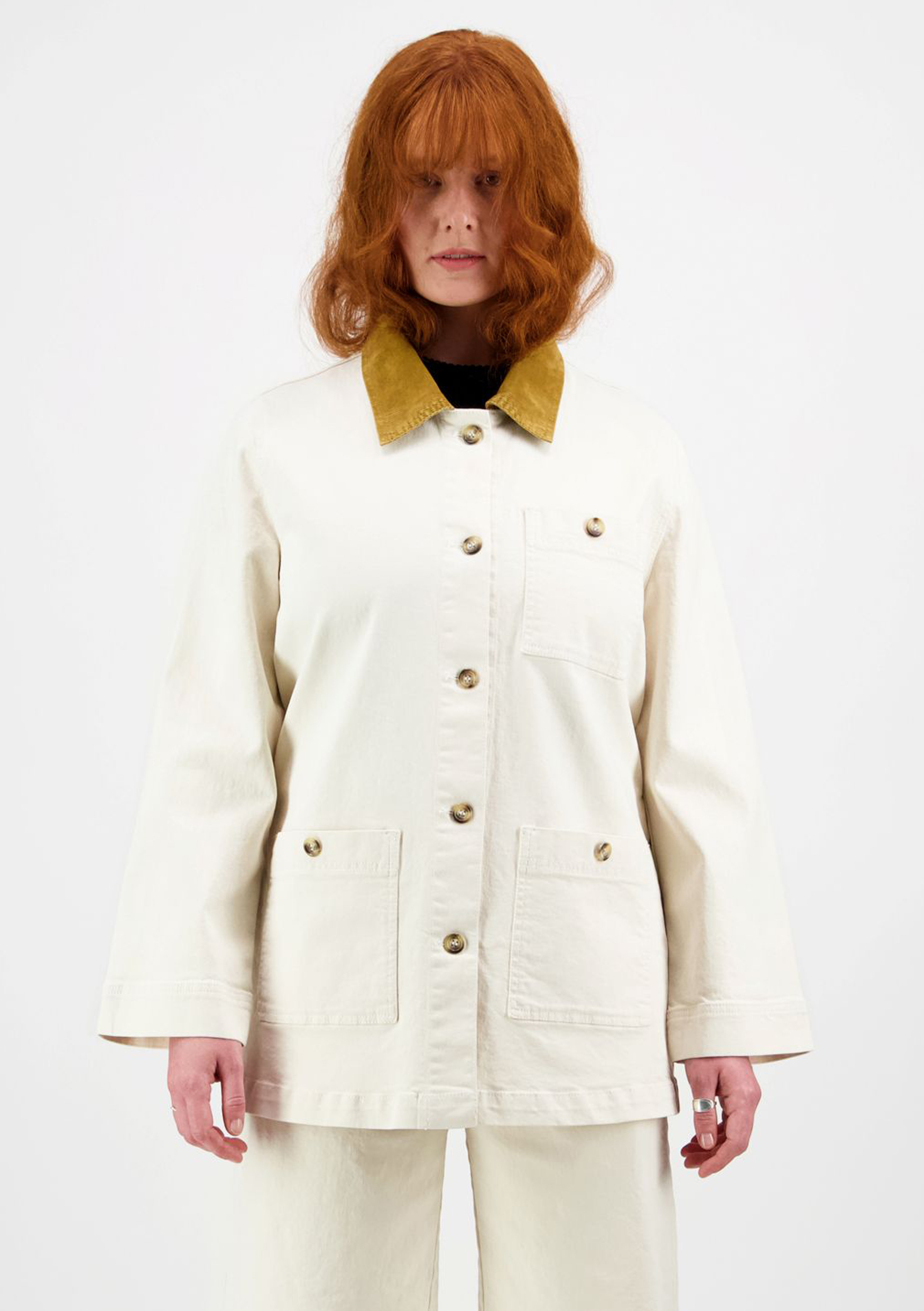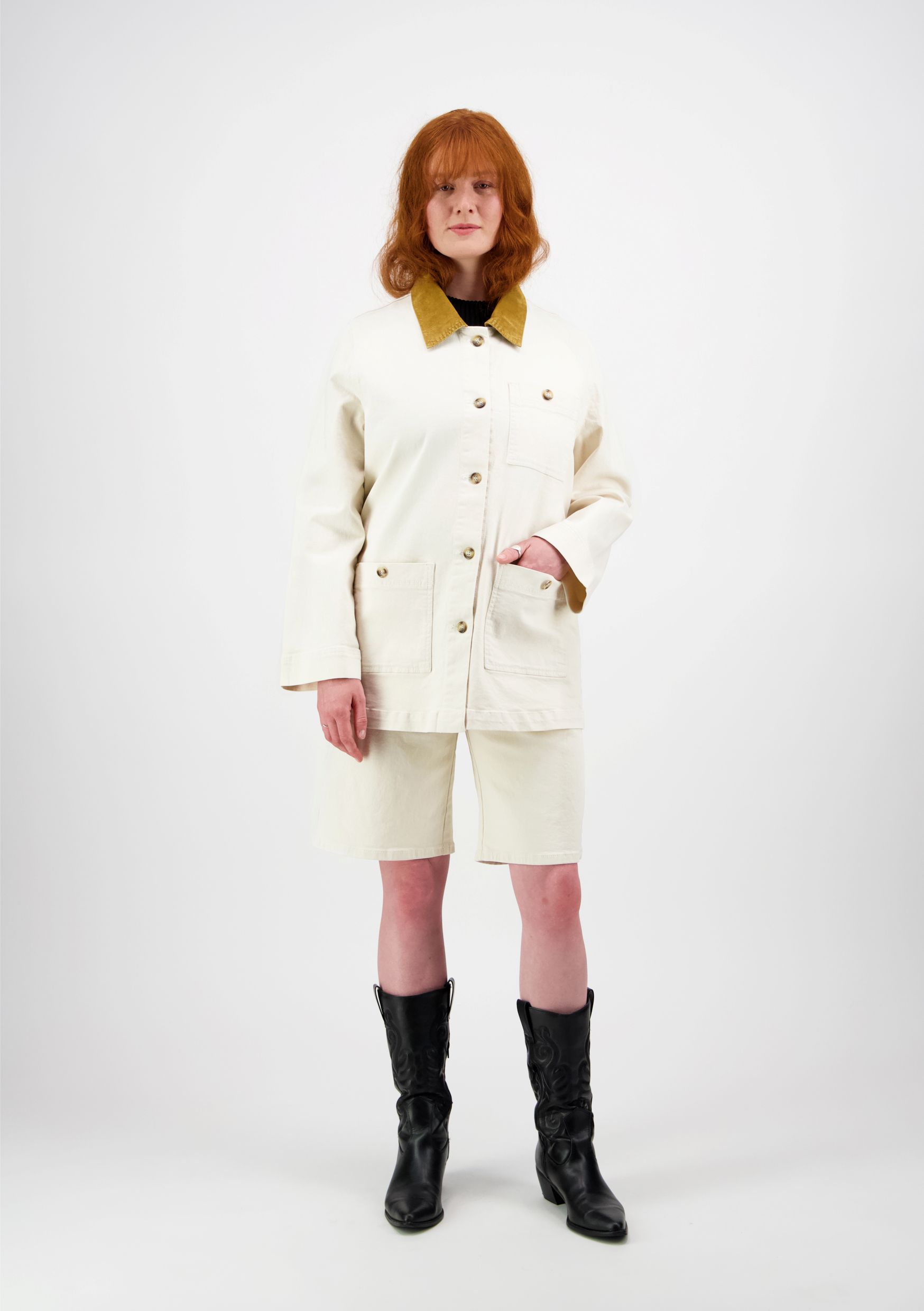 Luonnonvalkoinen farkkutakki, jossa on ruskeat samettikaulukset – pieni kontrasti, suuri vaikutus.